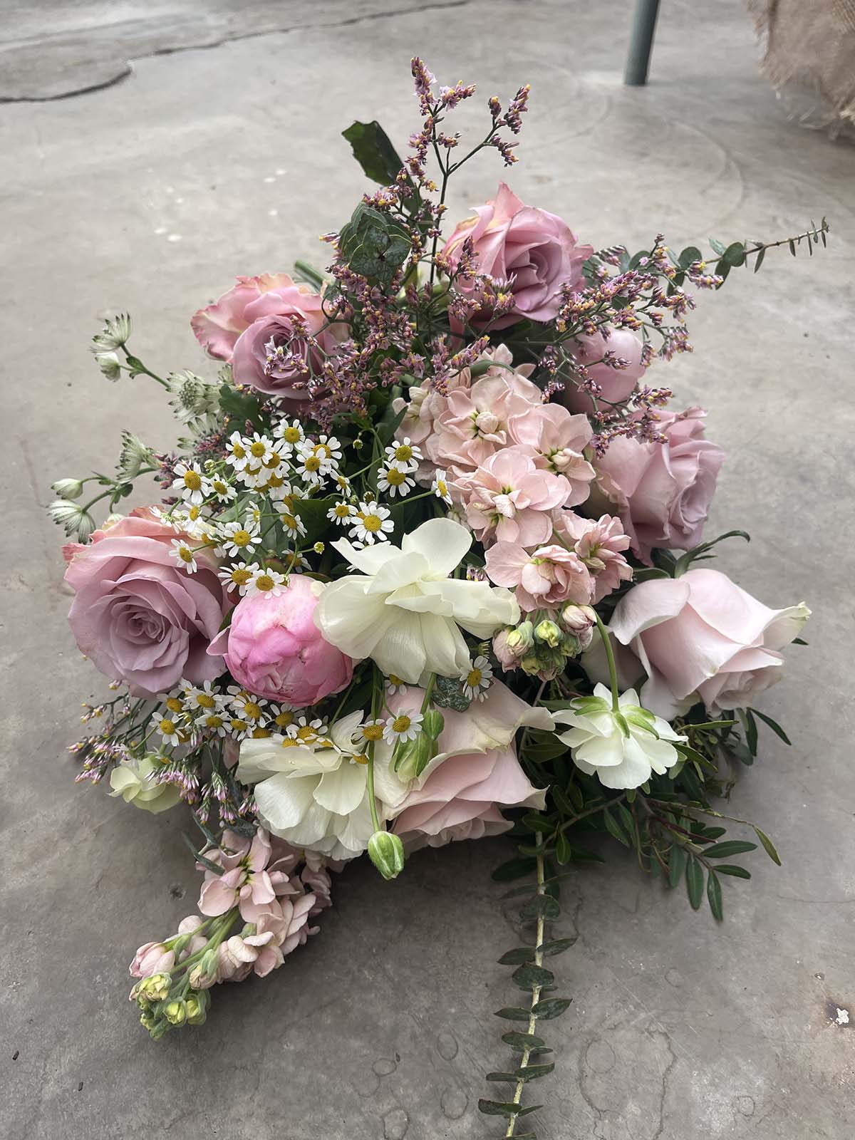 Sommarbukett med fjarilsranunkel, rosor, pioner, kamomill, limonium och grönt