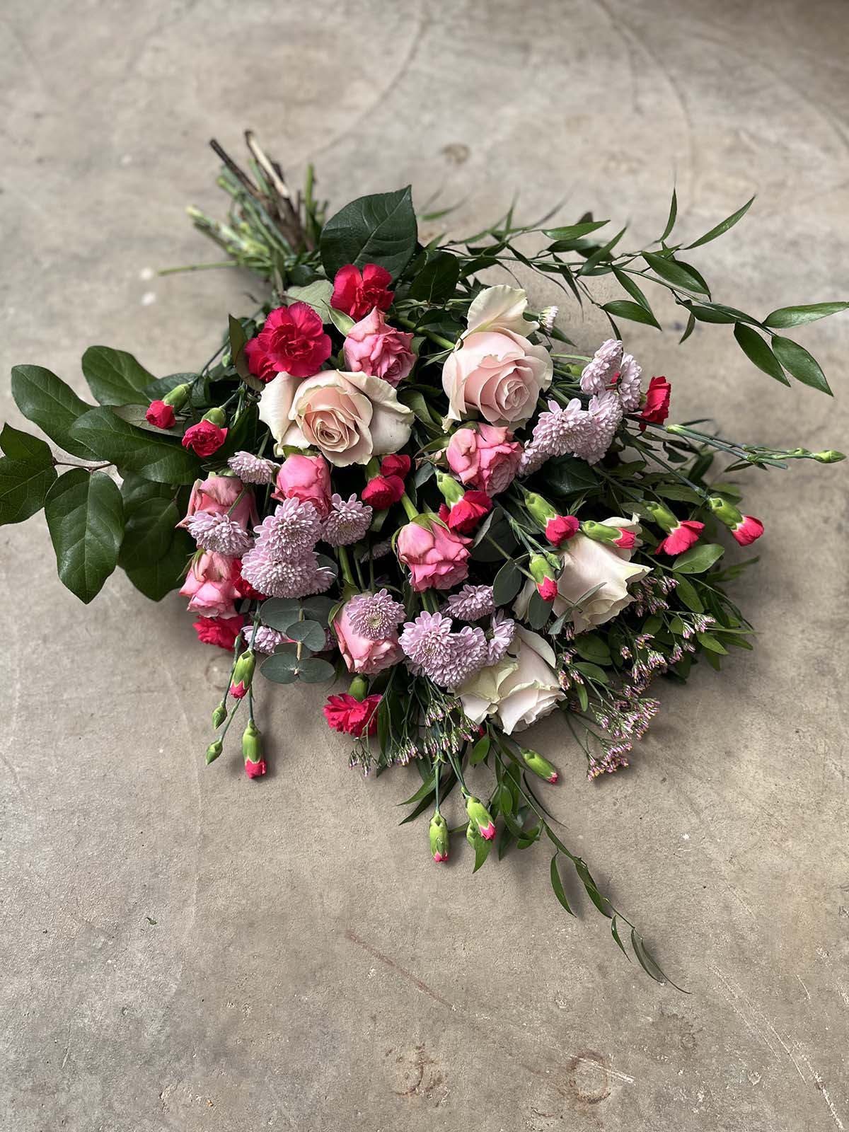 Bukett i rosa/cerice, rosor, kvistnejlikor, santini, limonium och grönt