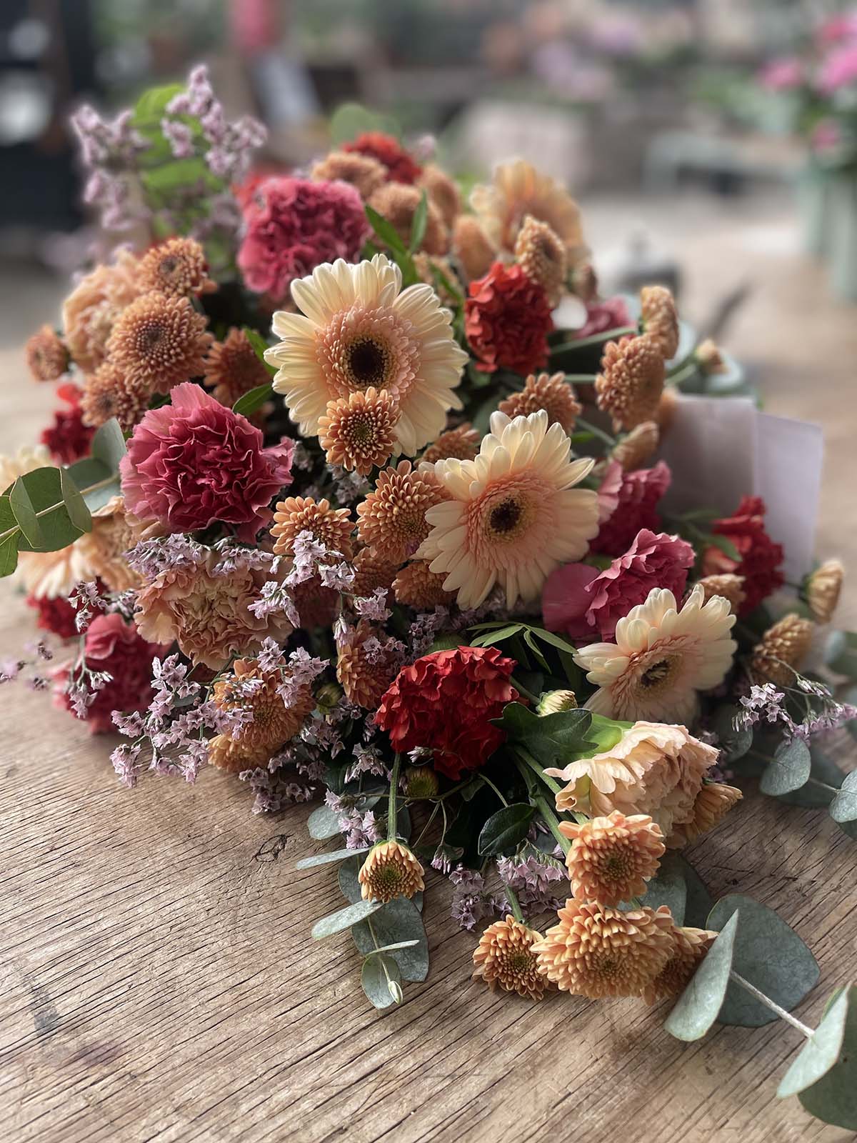 Bukett i creme, aprikos och rosa. Nejlikor, germini, santini, limonium