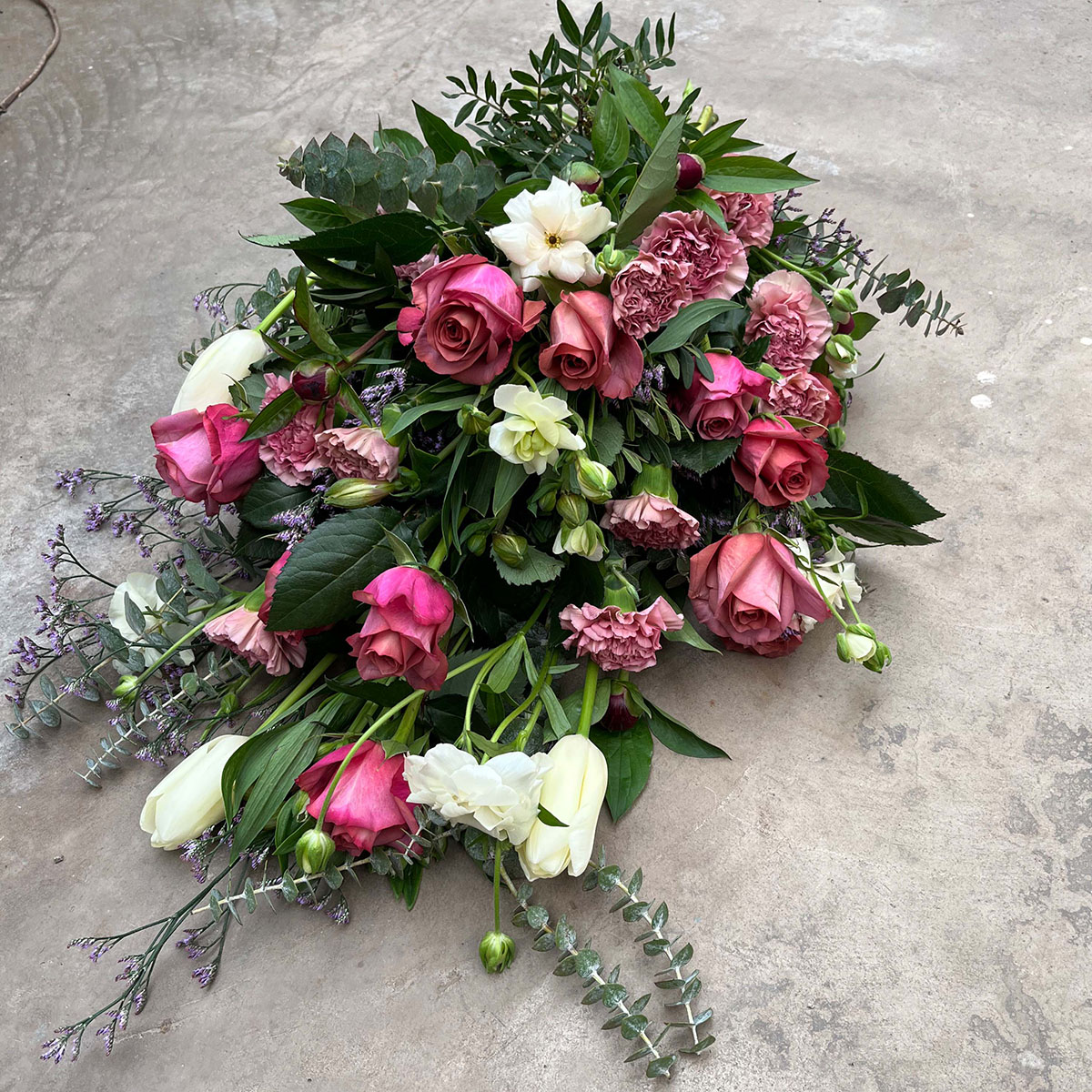 vårsäsong, franska tulpaner, fj’rilsranunkel, rosor, nejlikor, limonium, grönt