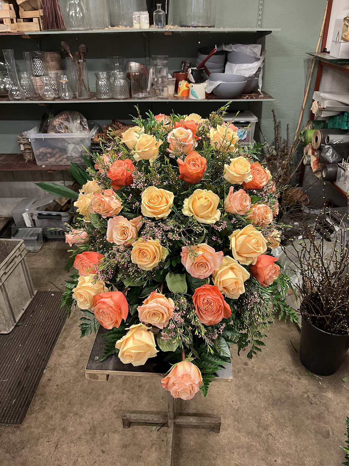 Aprikos, orange rosor i olika nyanser tillsammans med vacker vaxblomma