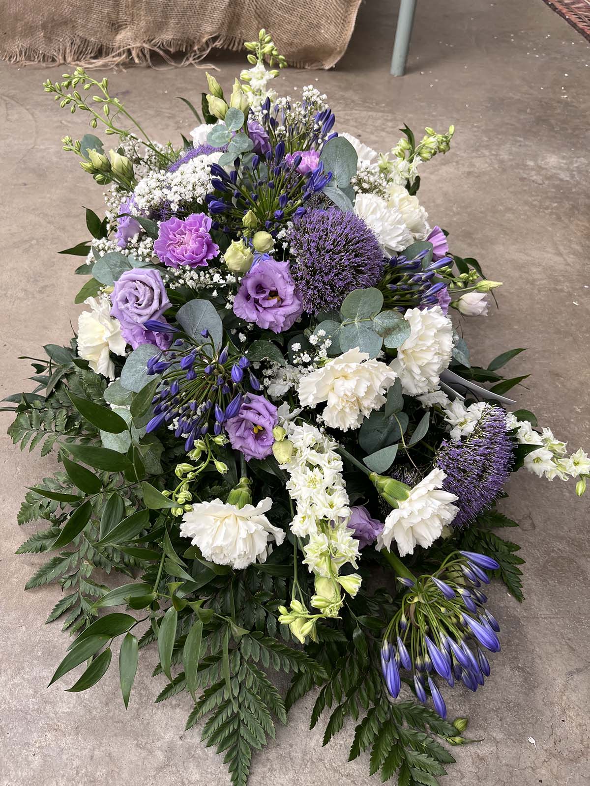 Låg sorgdekoration 7 i vitt och lila med bland annat nejlikor, lisianthus, riddarsporre, nejlikor och agapanthus